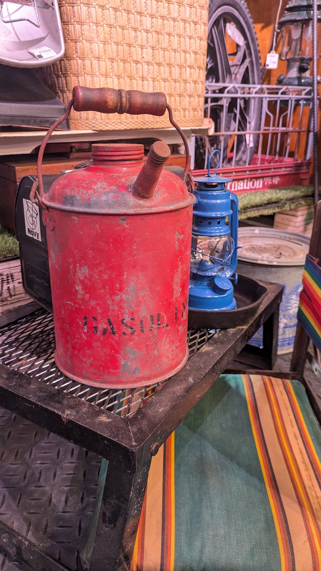 アメリカにて買い付けた貴重なビンテージガソリン缶です。 フォルムのかわいらしさとロスをなくす点などでビンテージスタイルに必須な携行缶。 抜群のボディカラーと特徴的なフォルム、 中でも雰囲気抜群なやや細口のタイプは、使いやすさや質、見た目ともにパーフェクト。 ウッドハンドルなどのディテールも、アメリカンビンテージに相性抜群な一品です。 キャンプで必須なホワイトガソリンや灯油、パラフィンオイルなど。 用途はもちろん、置いておくだけで絵になる最高なアイテムです! 当店の扱うアイテムは、全て一点物となっております。 同じものの無い唯一無二のアイテムを是非ご愛用くださいませ。 こちらのアイテムはビンテージ品となります。 画像にありますように、表面の薄いさび箇所程度あります。 古い物になりますが、漏れなどもなく使用に関して支障のある箇所等もありません。 こちらはご要望の方に、タンクシーラーにて更なる補強も承ります。 ご要望の方はぜひメッセージにてお伝え下さい。 こちらはビンテージ・Used品となりますので、 色やサイズ、状態等で気になる点がありましたら、お気軽にお問い合わせください。 Size 1ガロン(約3.8リットル)縦 約23cm 底部直径 約17cm <返品・交換> 当店のアイテムは基本的にビンテージ・Used品になり、 返品交換等は承っておりません。 当店の原因による破損や不良等に関しましては、お問い合わせくださいませ。 <注意事項> 当店のアイテムは全て一点物になります。 掲載アイテムは店舗でも販売しておりますので、入れ違いの際は ご了承くださいませ。 また撮影の際に写している周りのアイテム類は対象外になります。