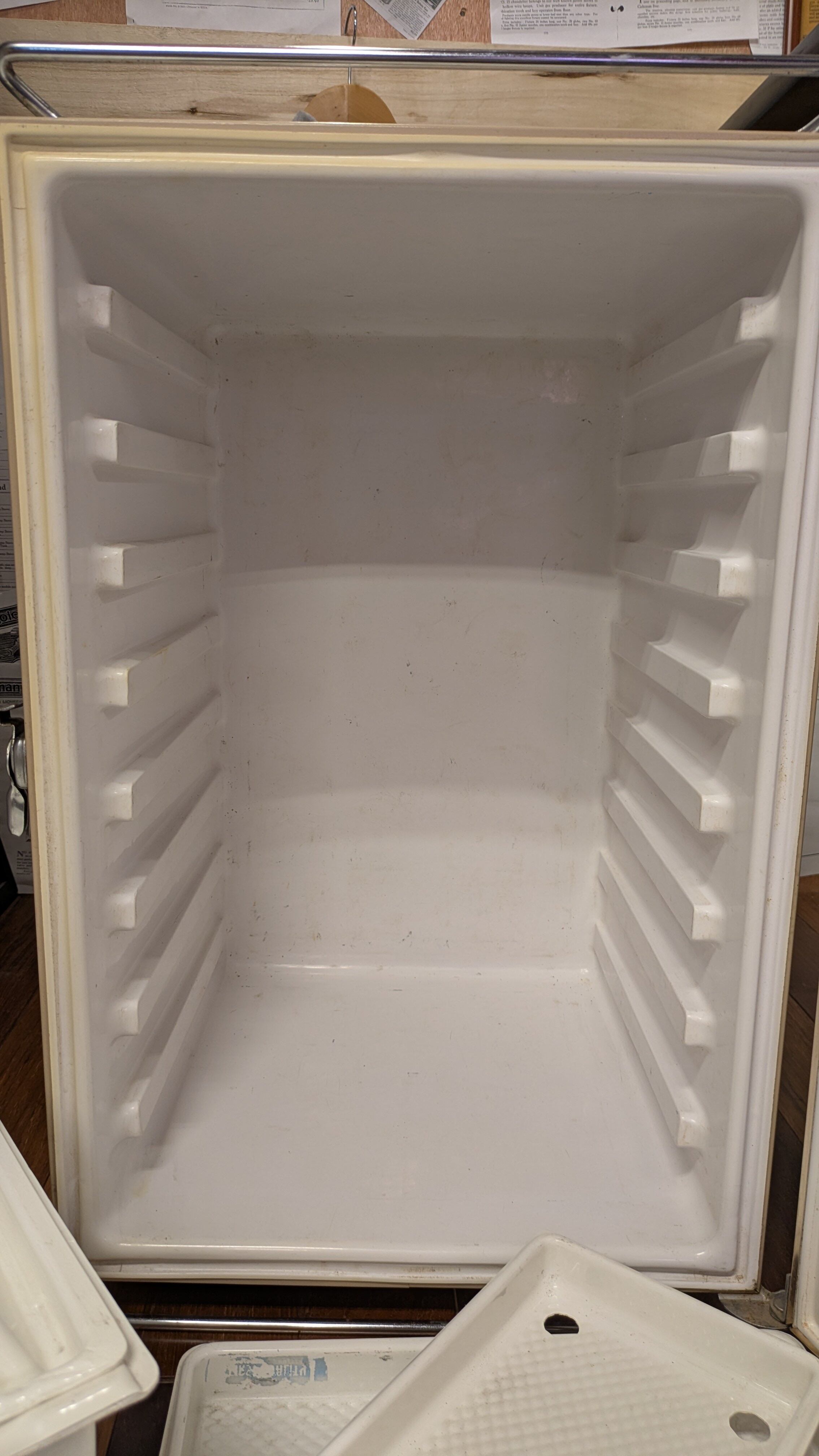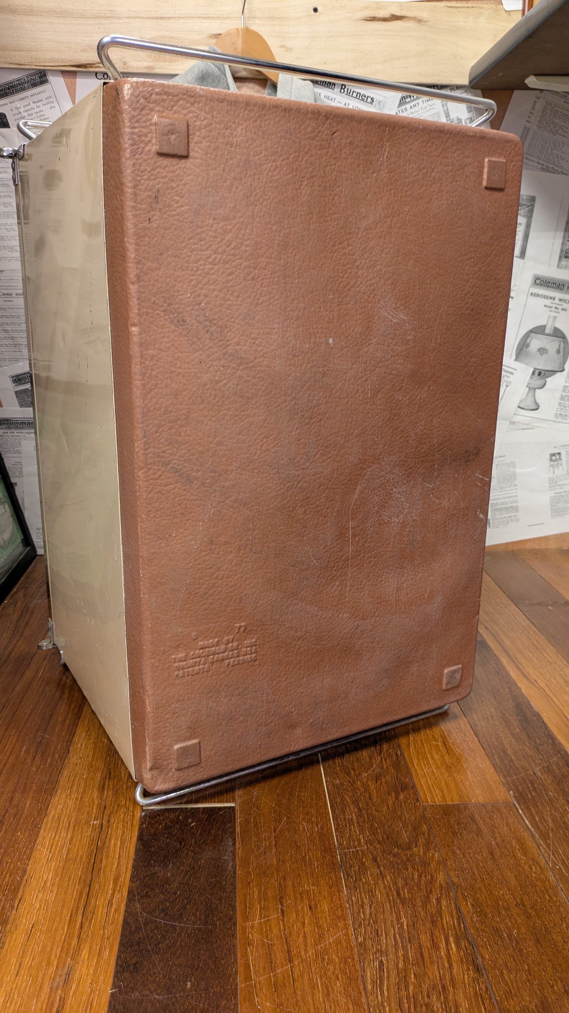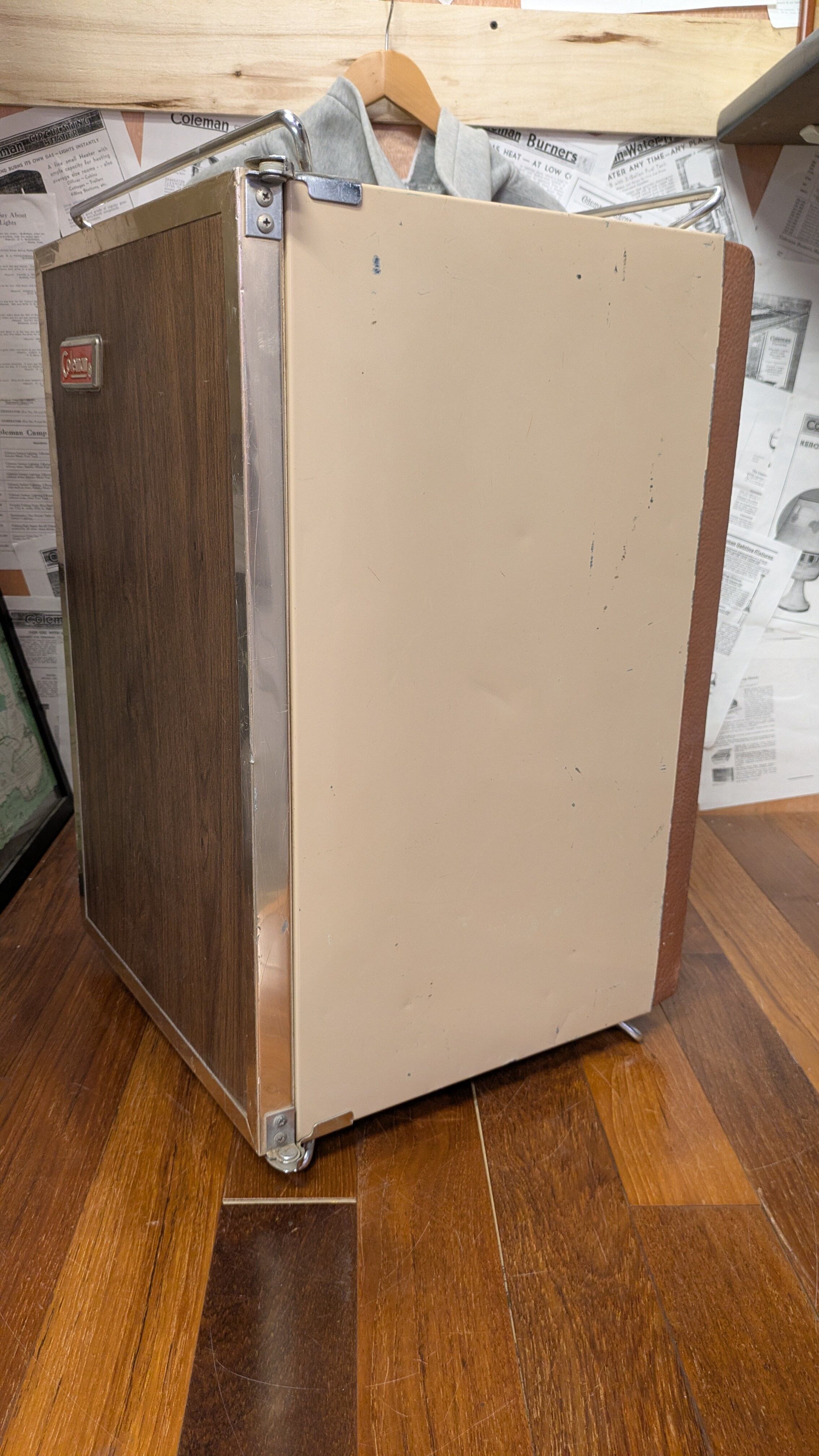 木目のドアのカラーが特徴的なビンテージ縦型クーラーボックスです。