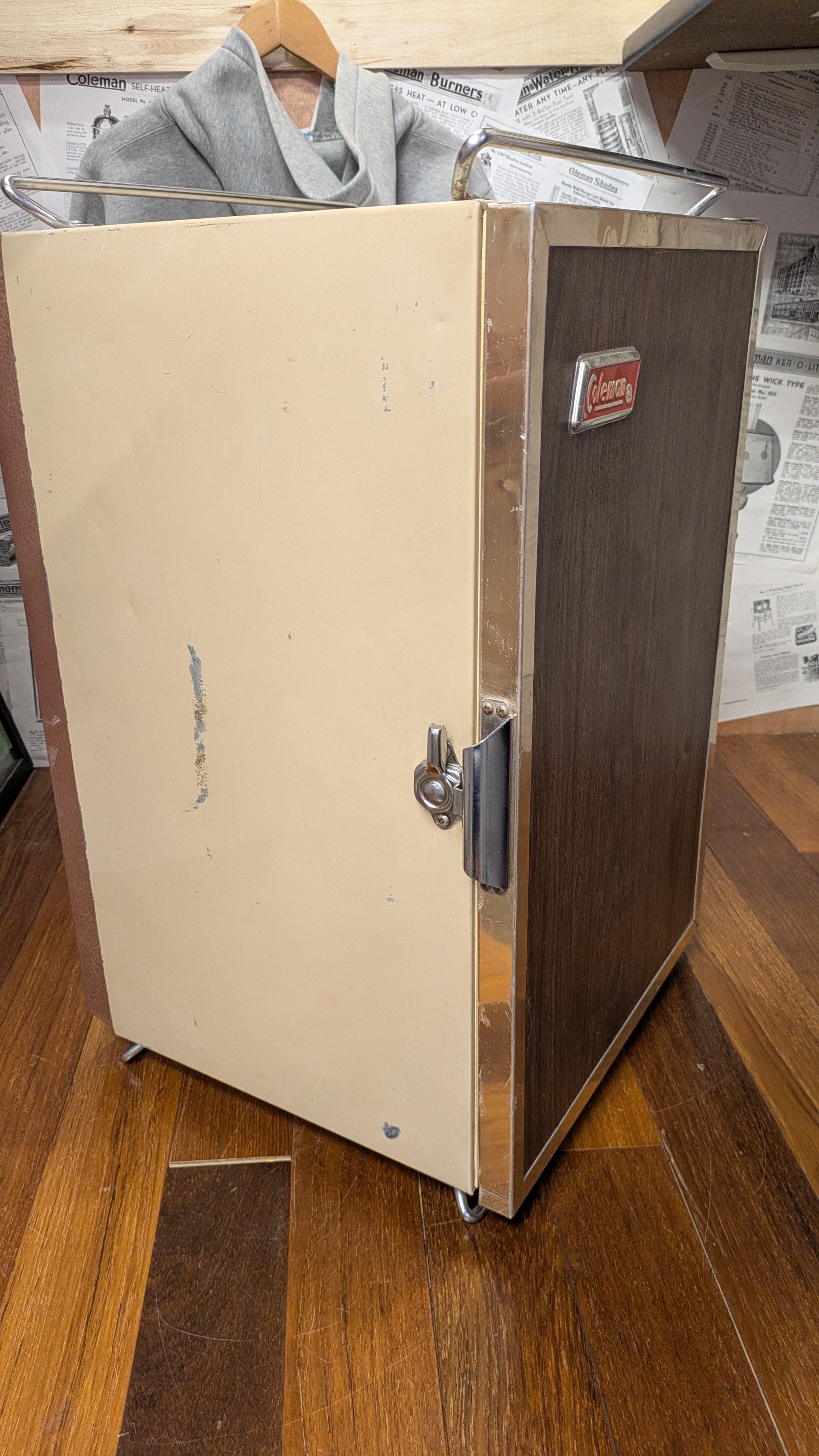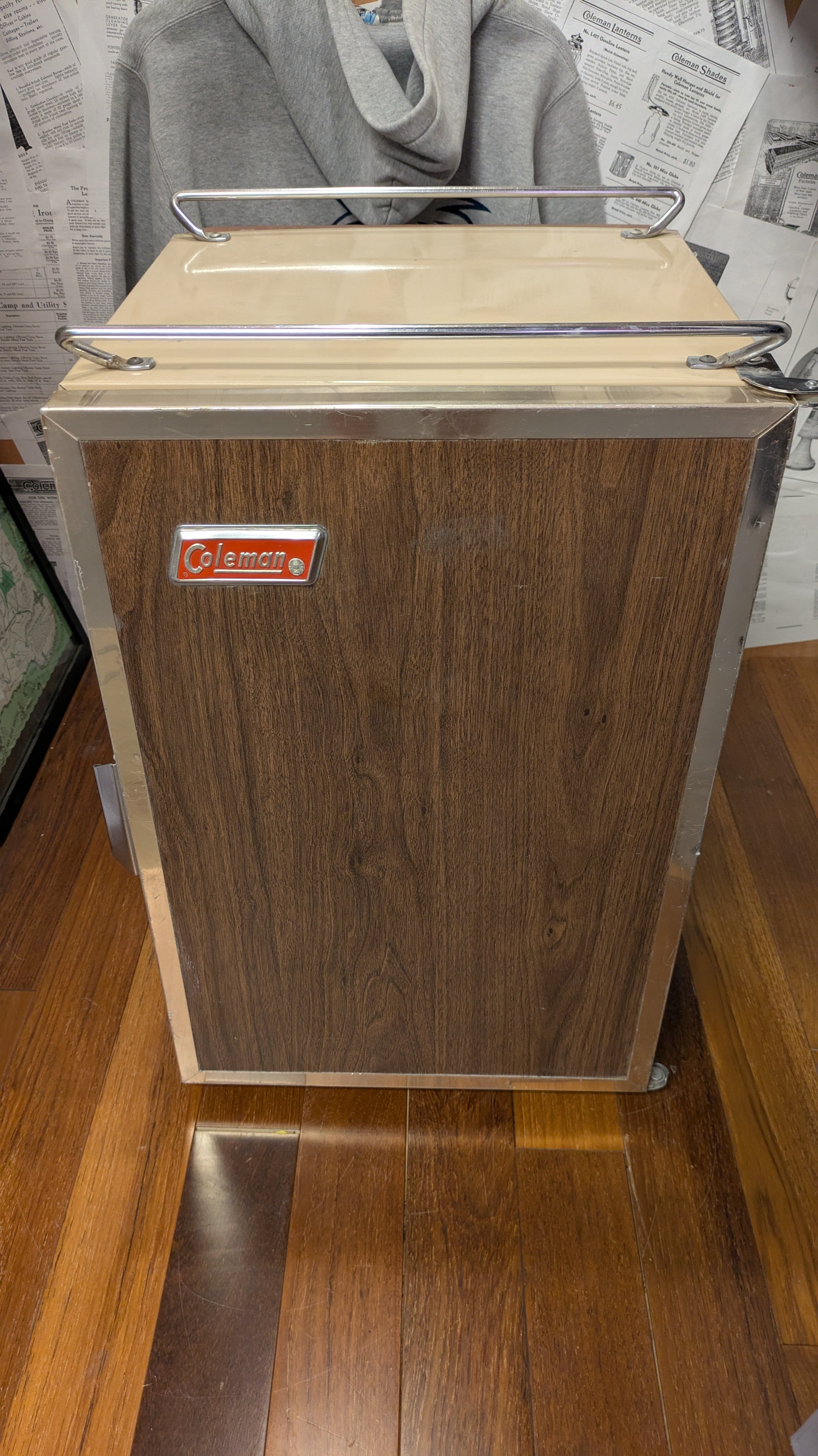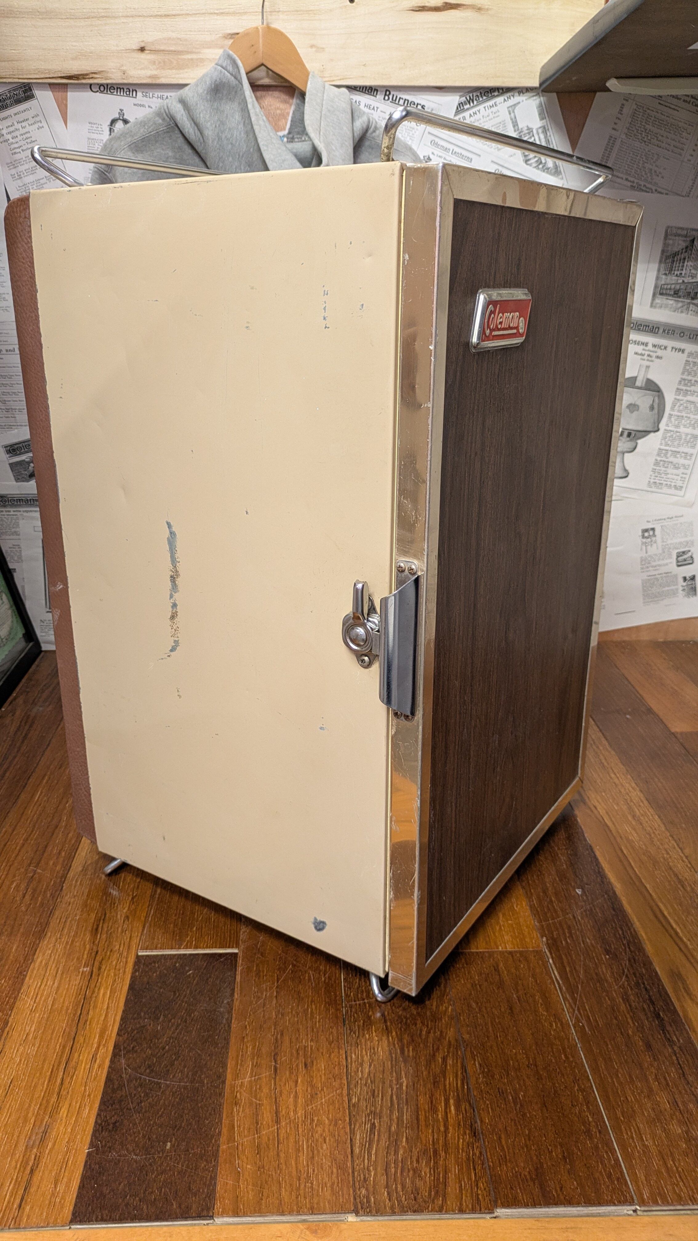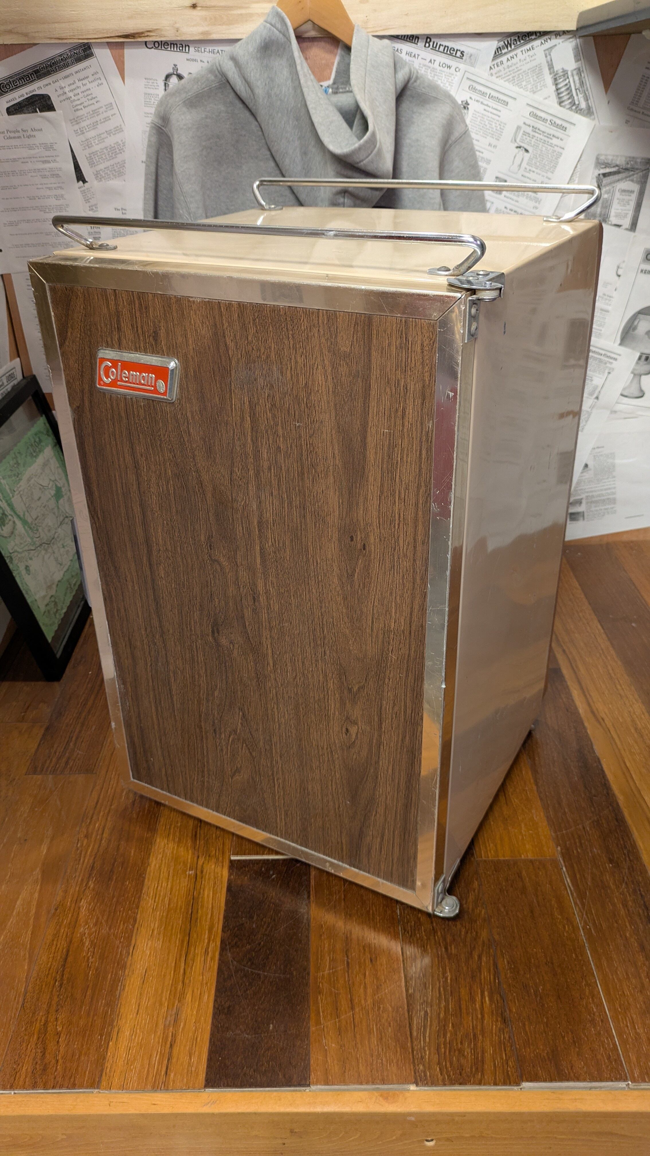 Vintage Coleman WoodyBrown CoolerBox IceChest Chocolate ビンテージ コールマン 縦型 クーラーボックス キャンプ クーラー チョコパフェ ブラウン 木目 キャンピングカー