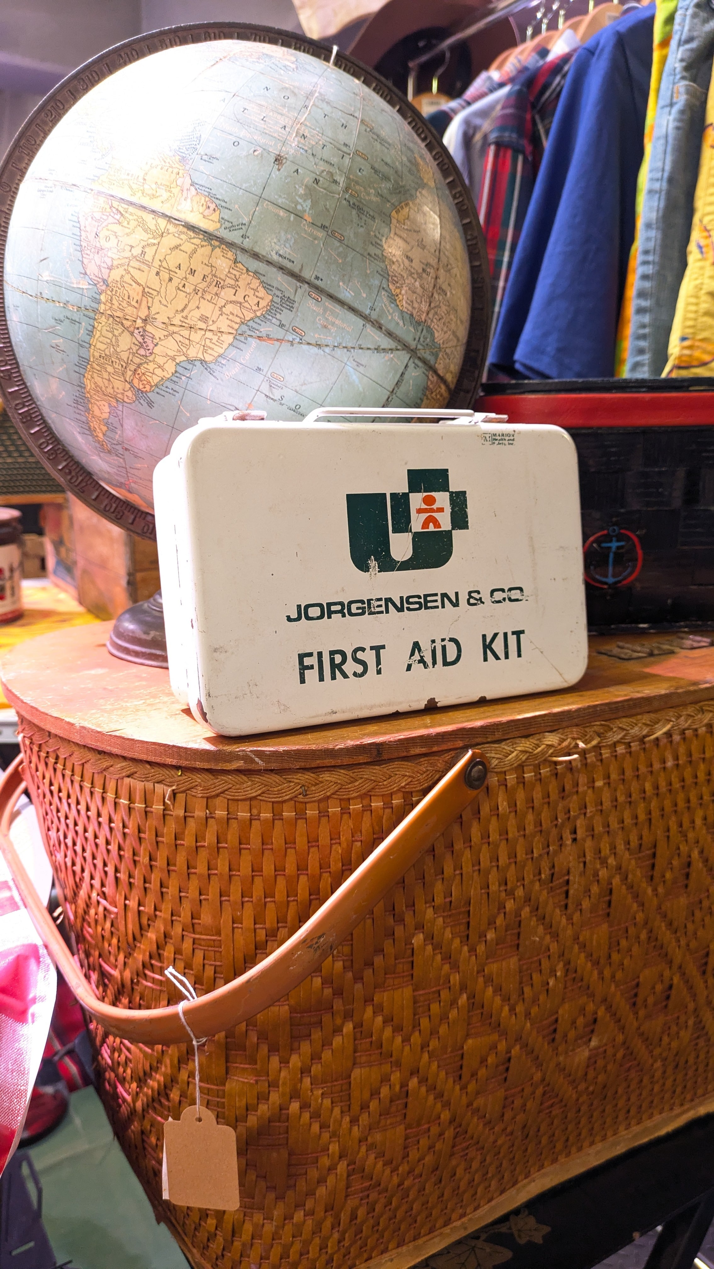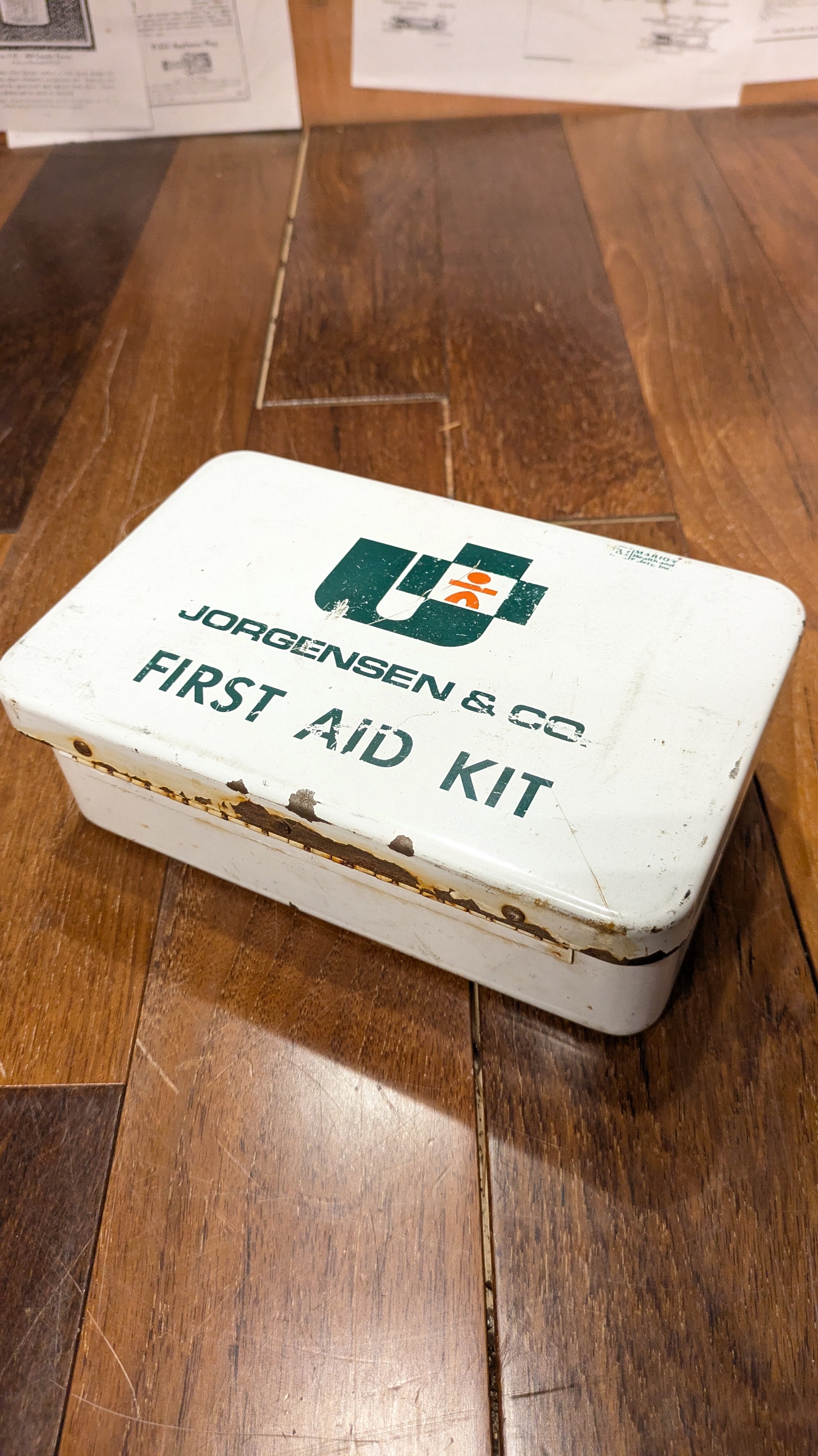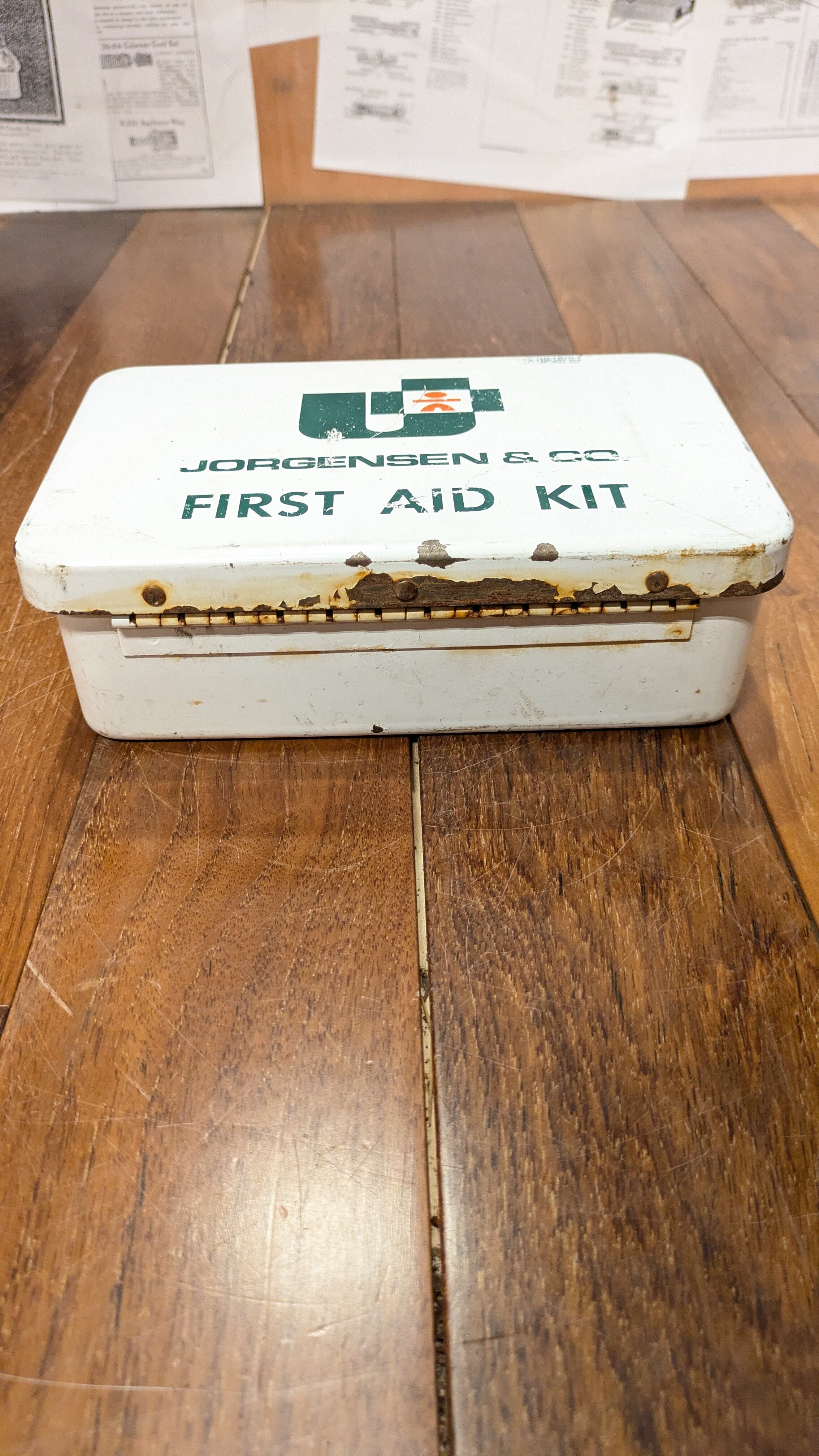 アメリカにて買い付けた貴重なビンテージJORGENSEN社のFirstAid缶です。