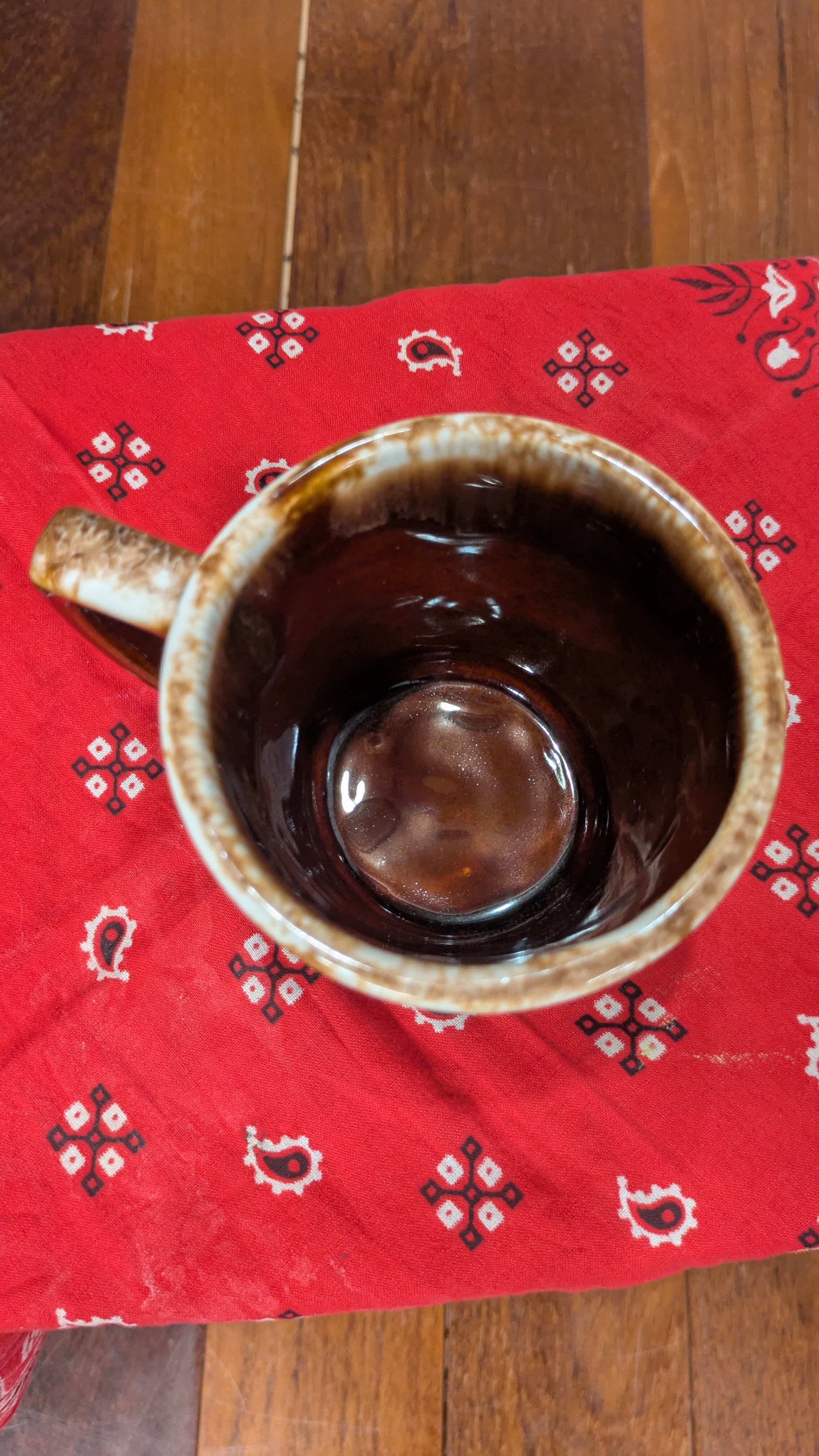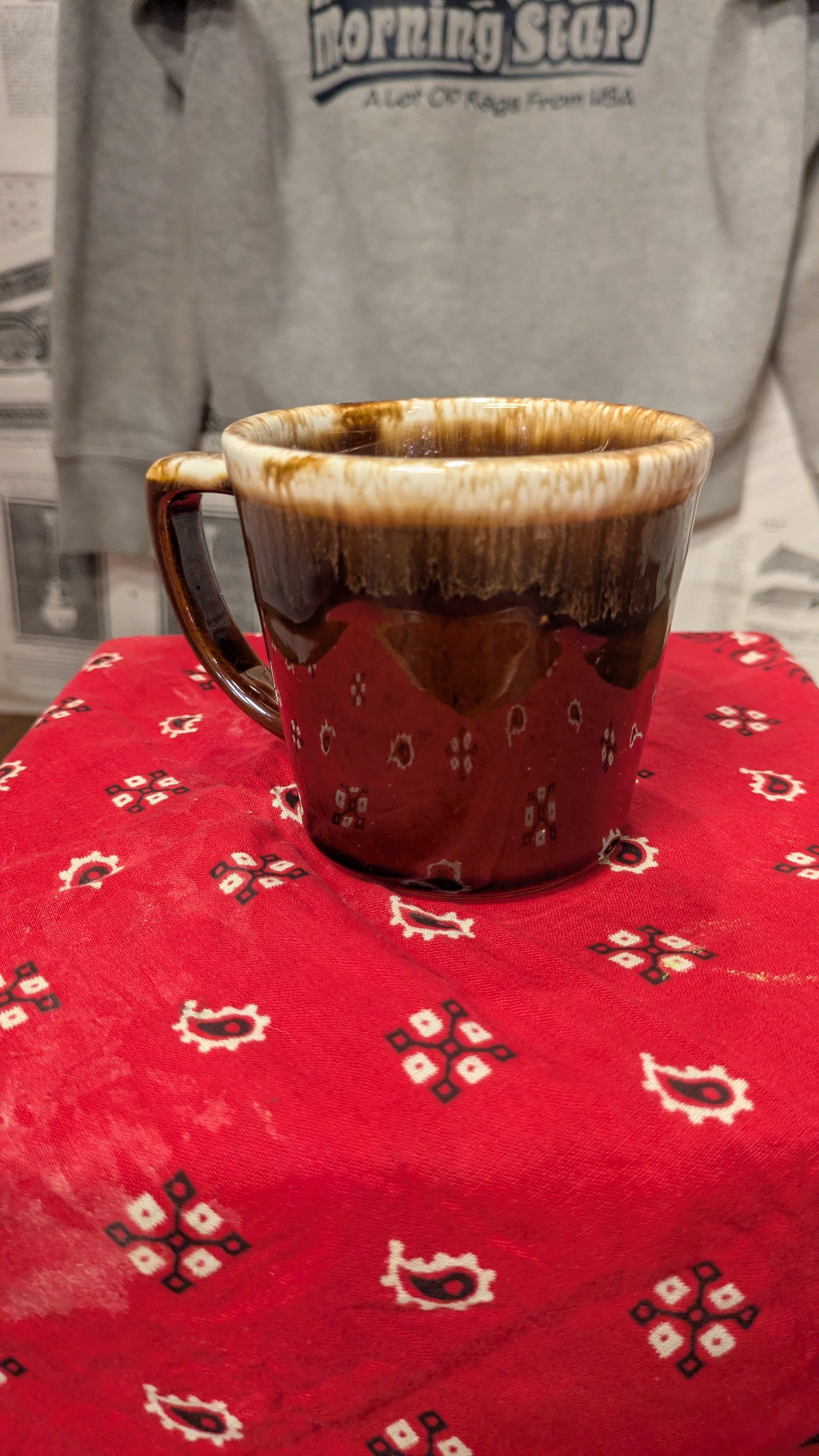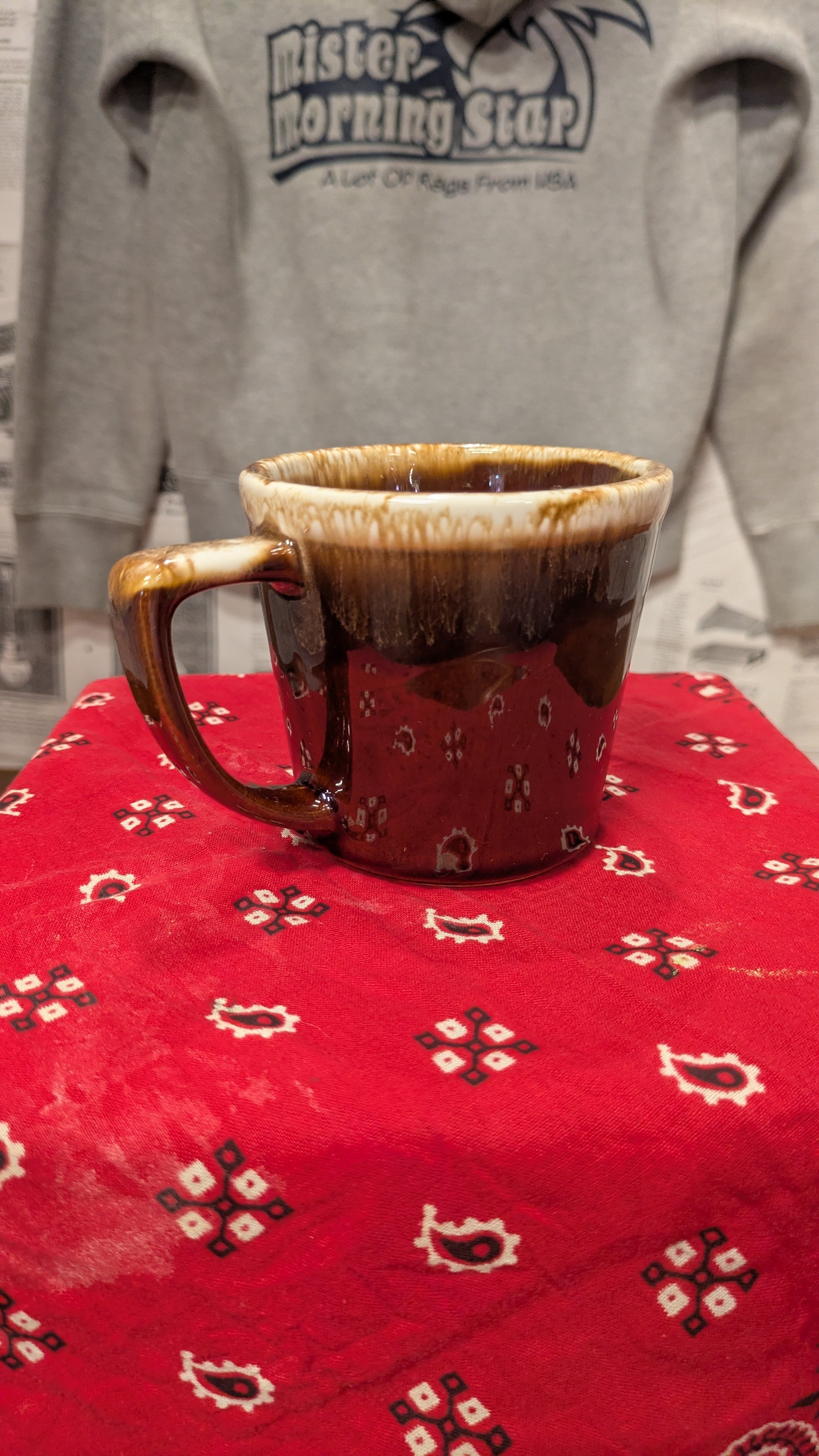 特徴的なブラウンドリップグリーズのビンテージマグカップです。