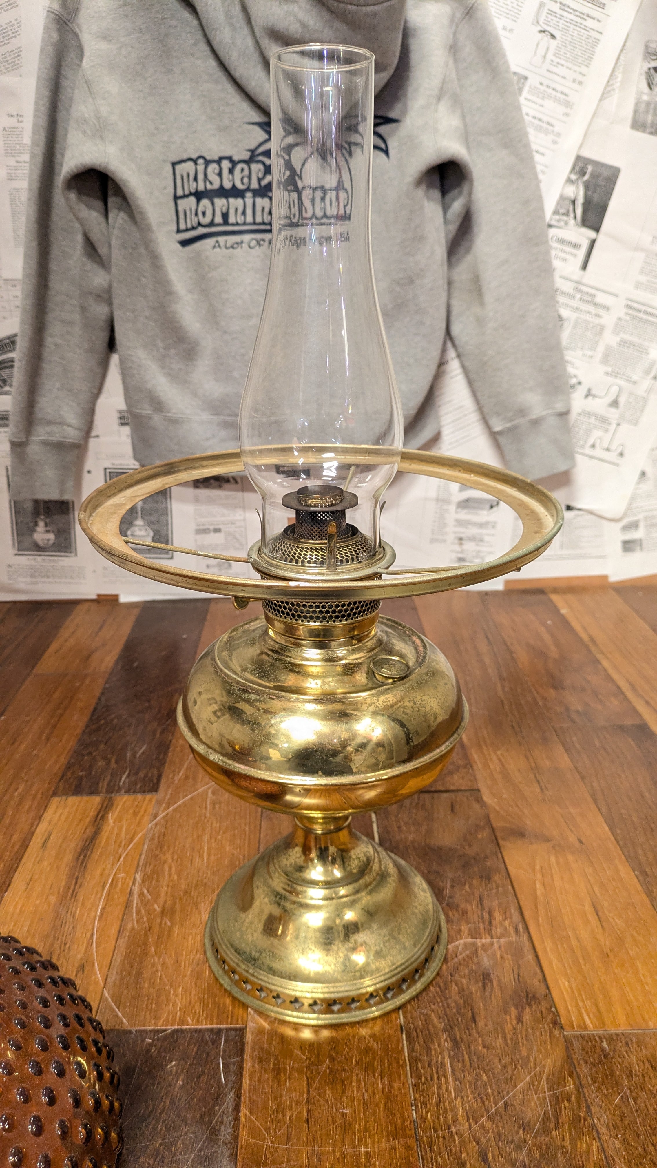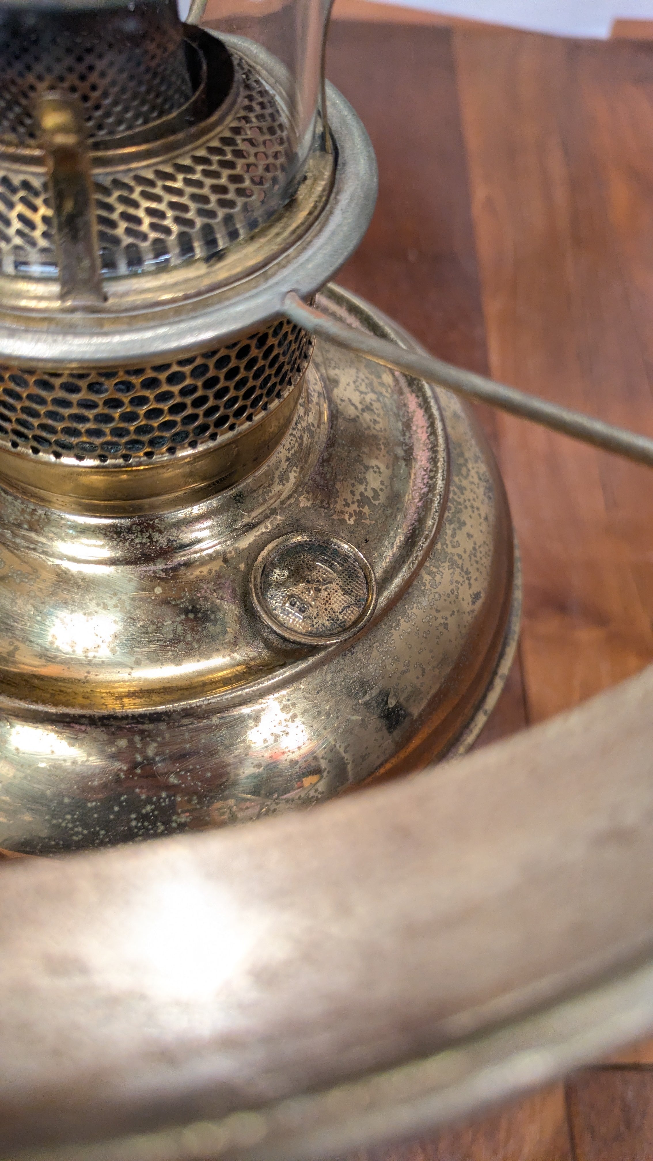 灯油仕様の古いテーブルランプで、そのやさしい雰囲気満点な灯りは、