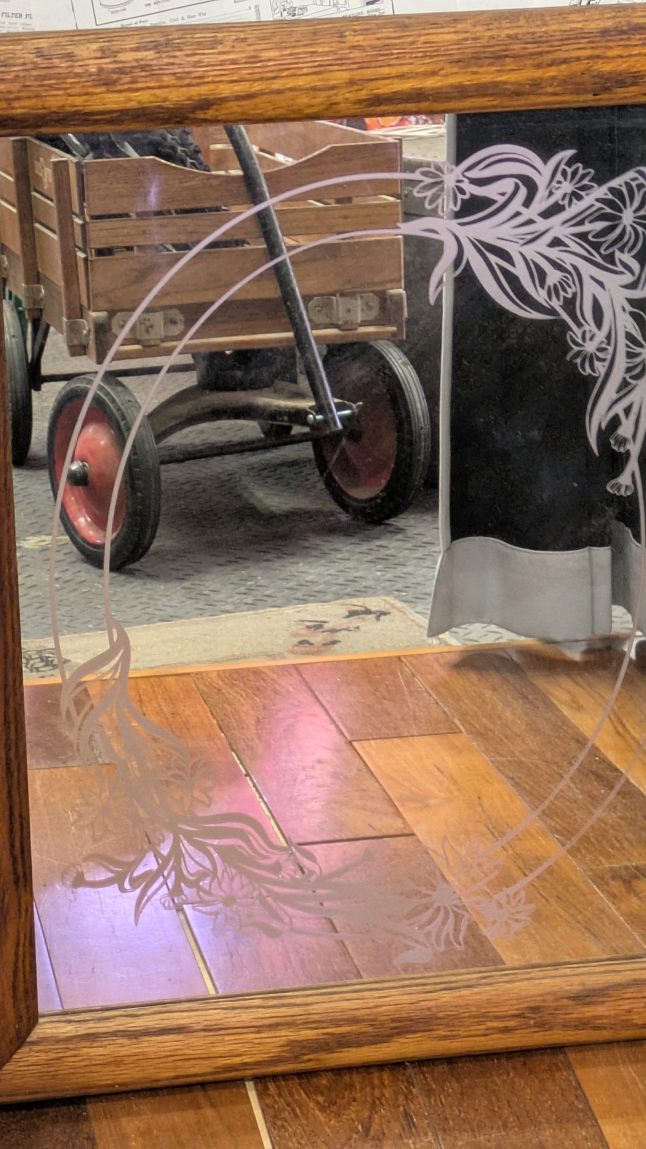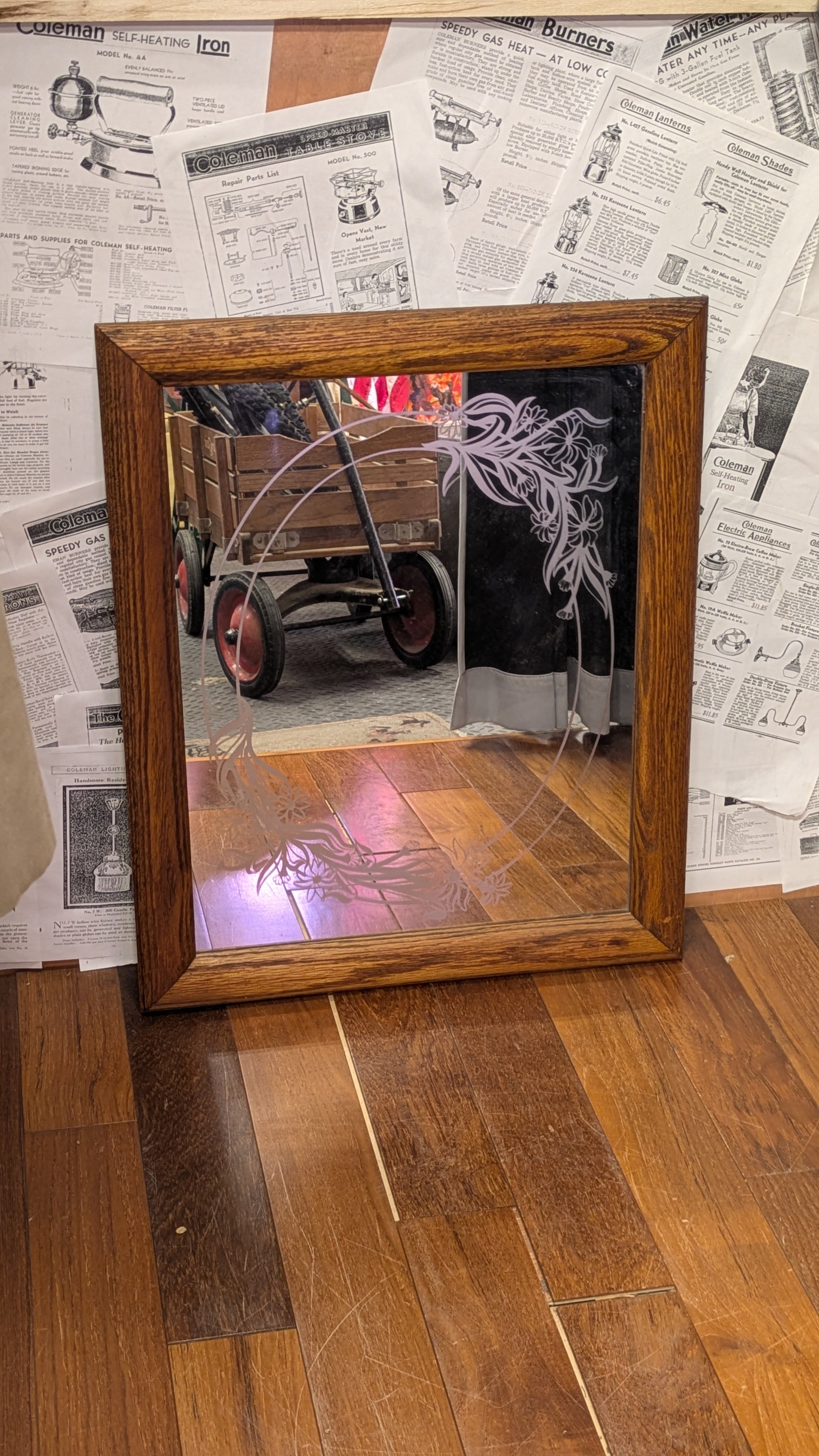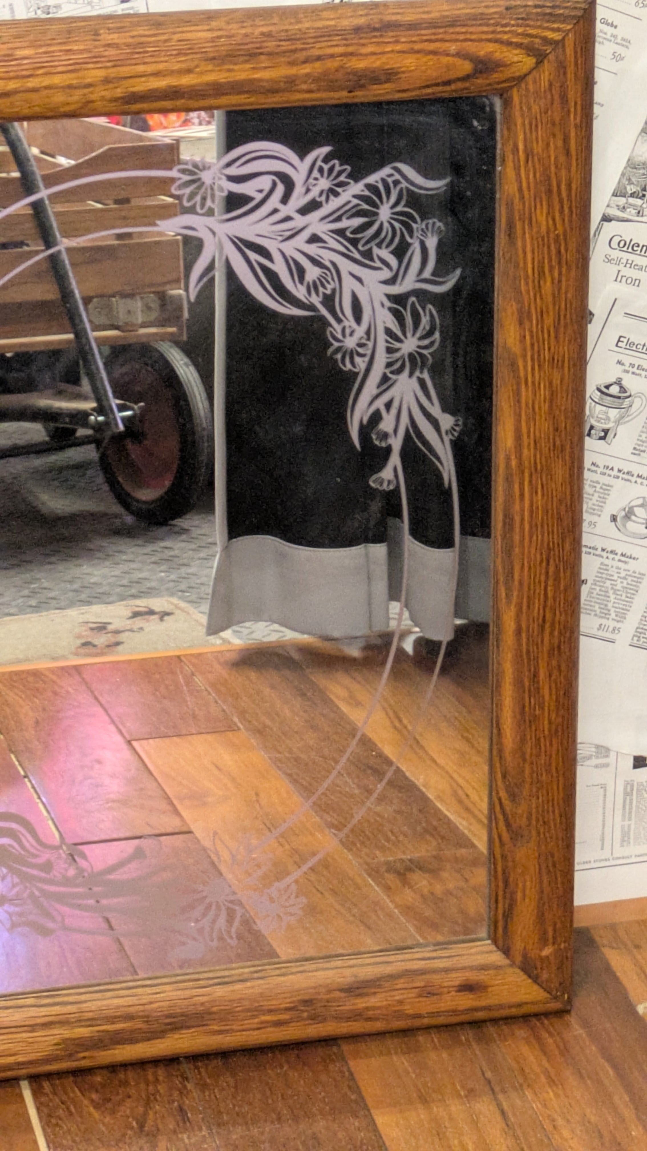 Vintage Etching Glass Mirror Flower ART ビンテージ エッチングミラー 鏡 花柄 アート 壁掛け鏡 アメリカ製 ビンテージ雑貨 アメリカ雑貨