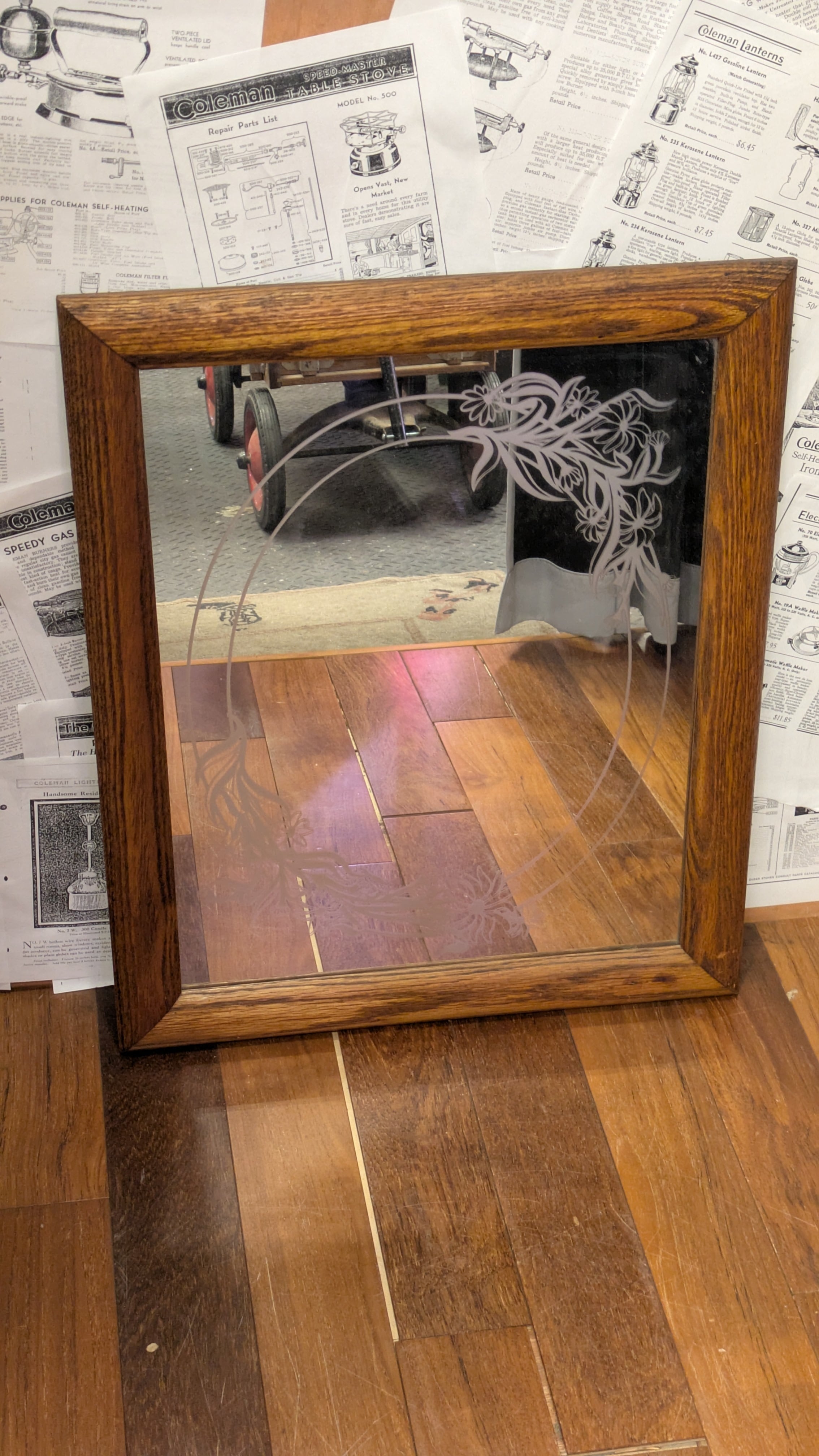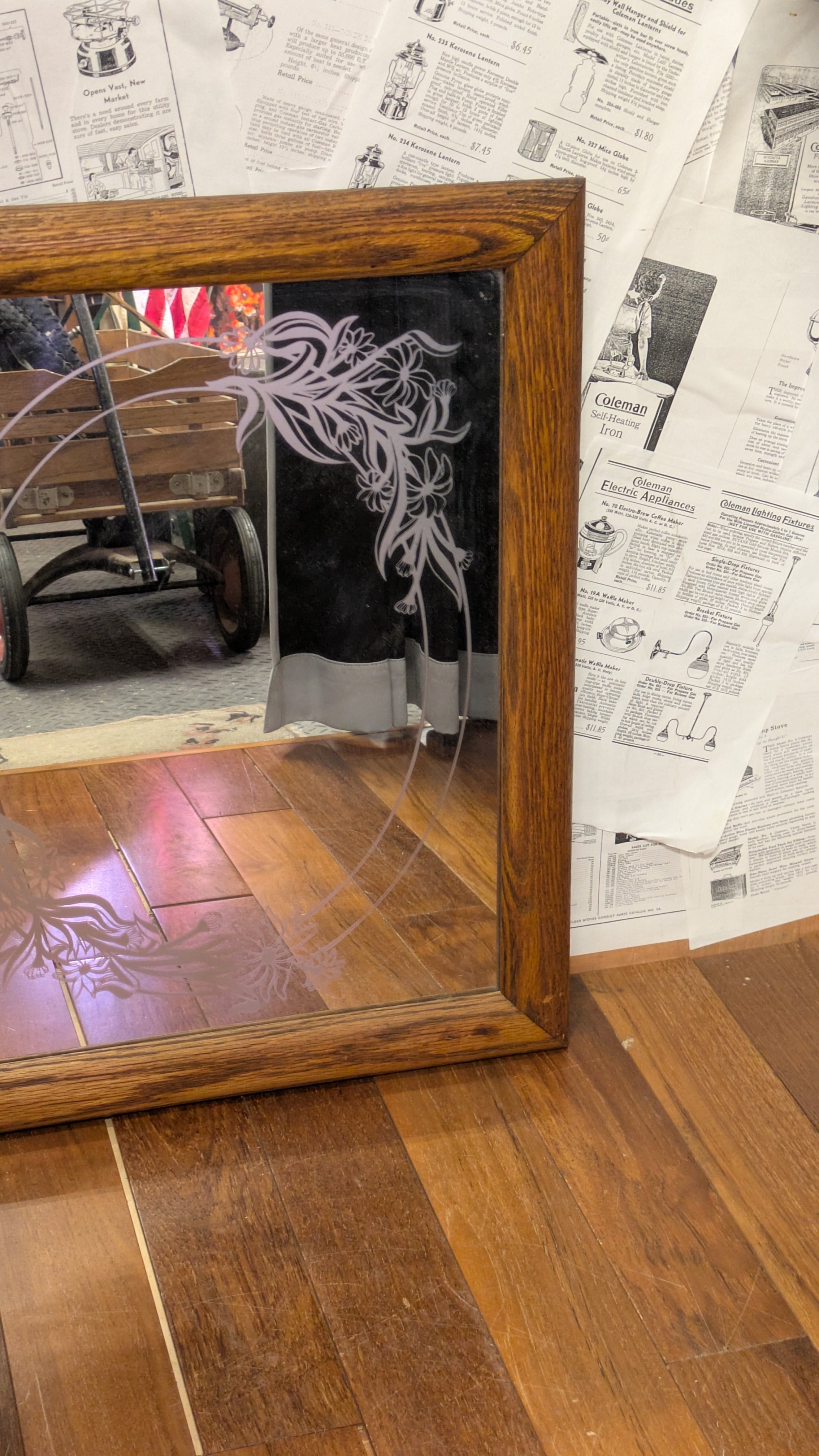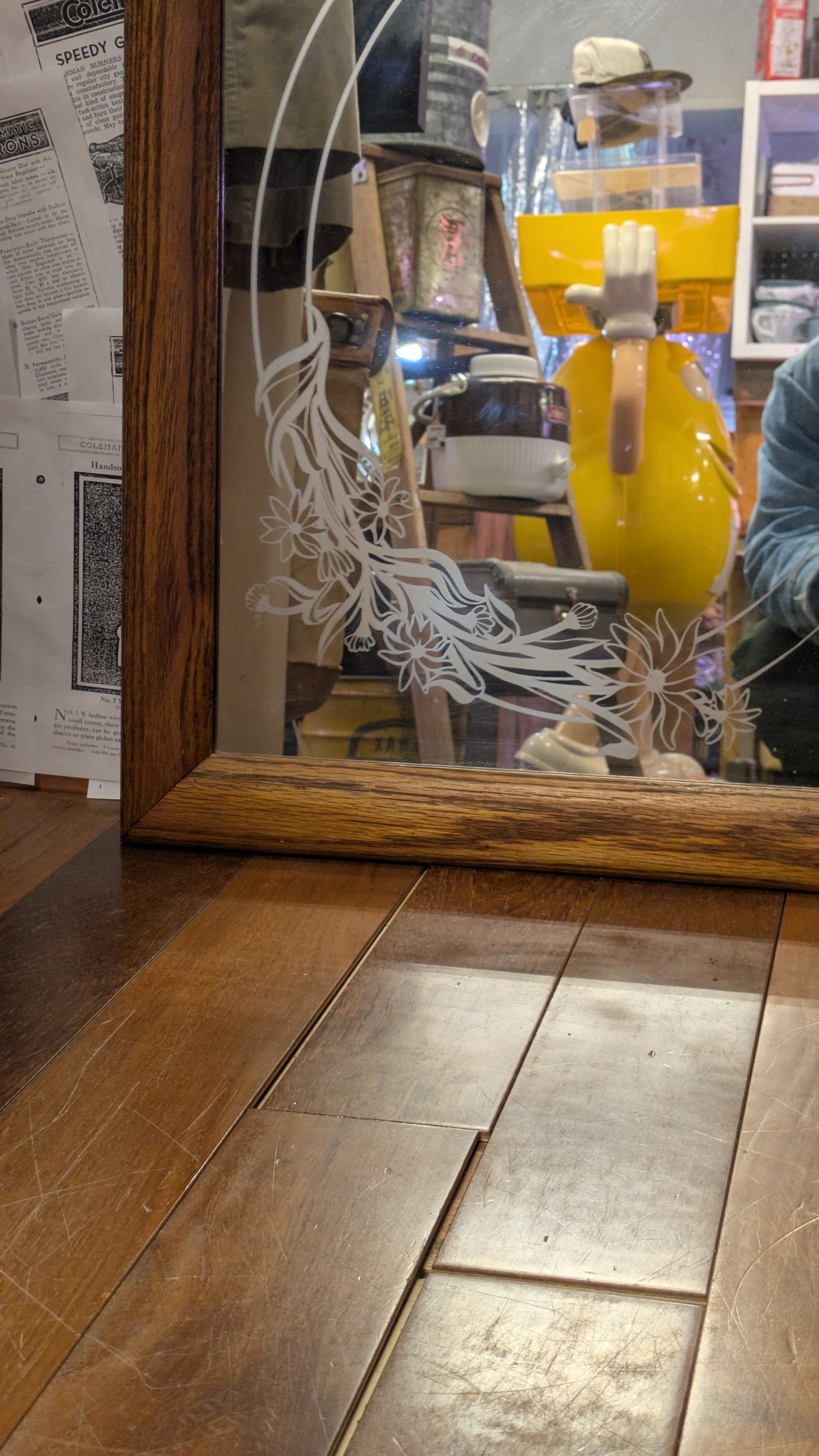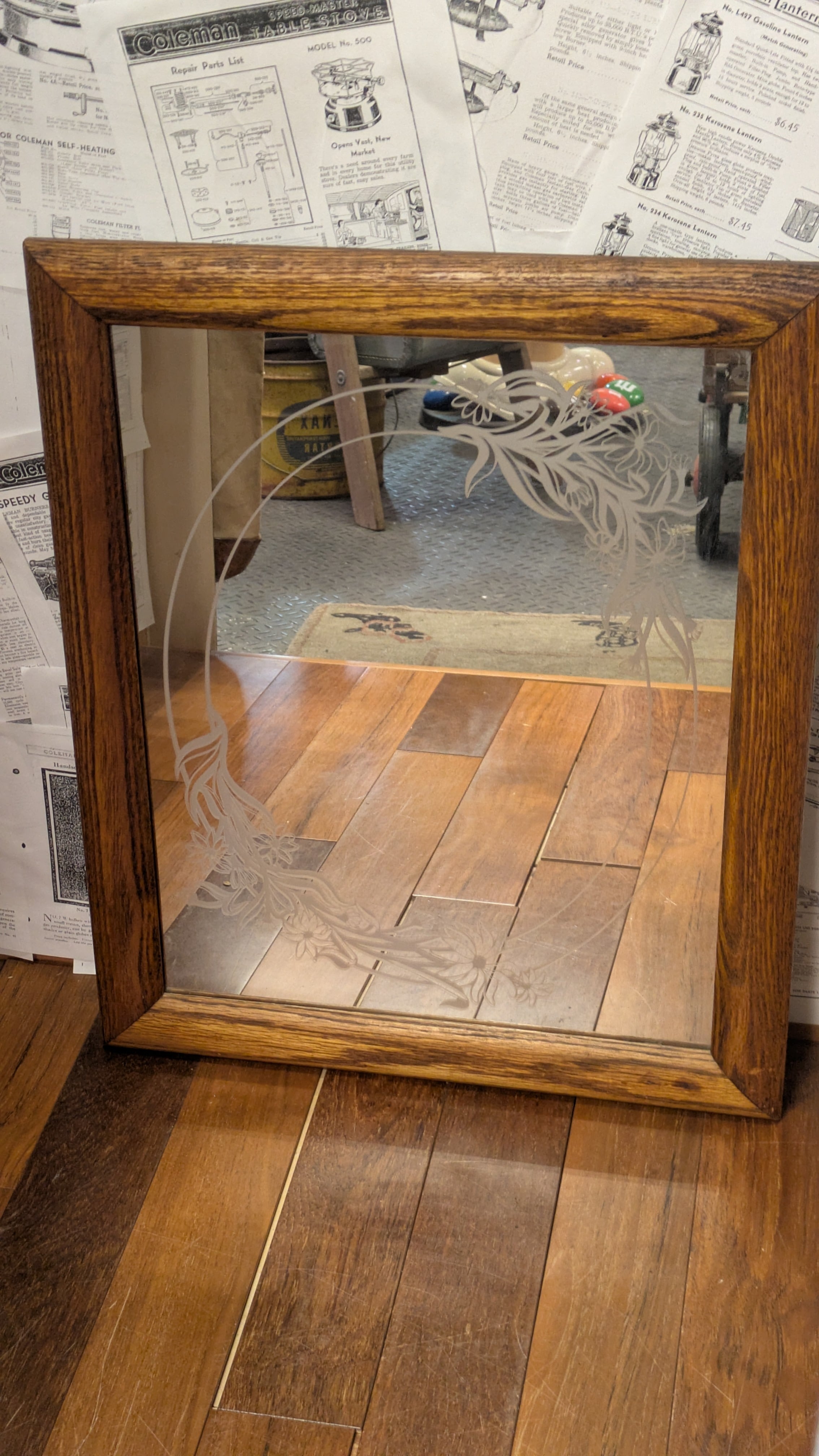 Vintage Etching Glass Mirror Flower ART ビンテージ エッチングミラー 鏡 花柄 アート 壁掛け鏡 アメリカ製 ビンテージ雑貨 アメリカ雑貨