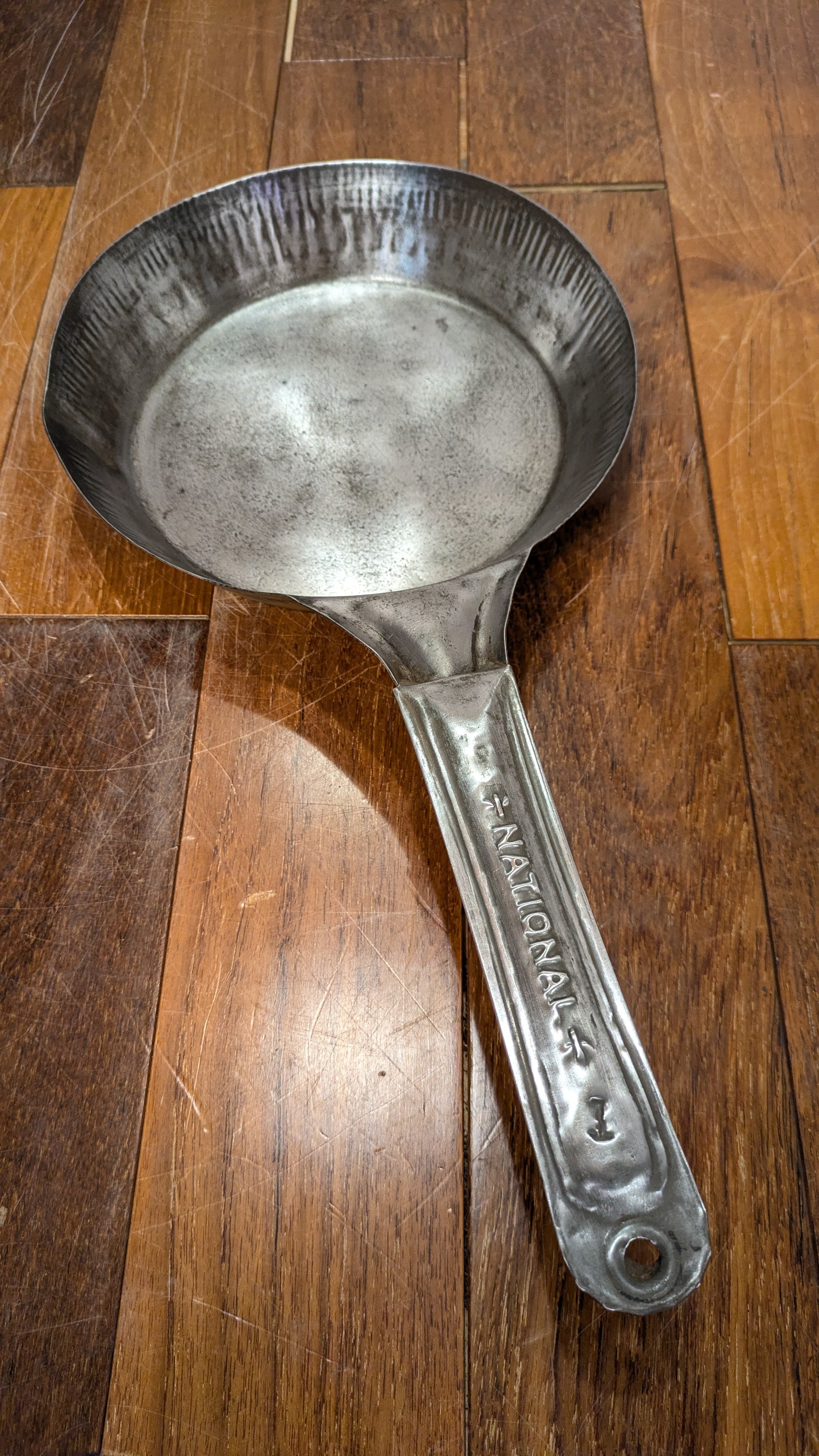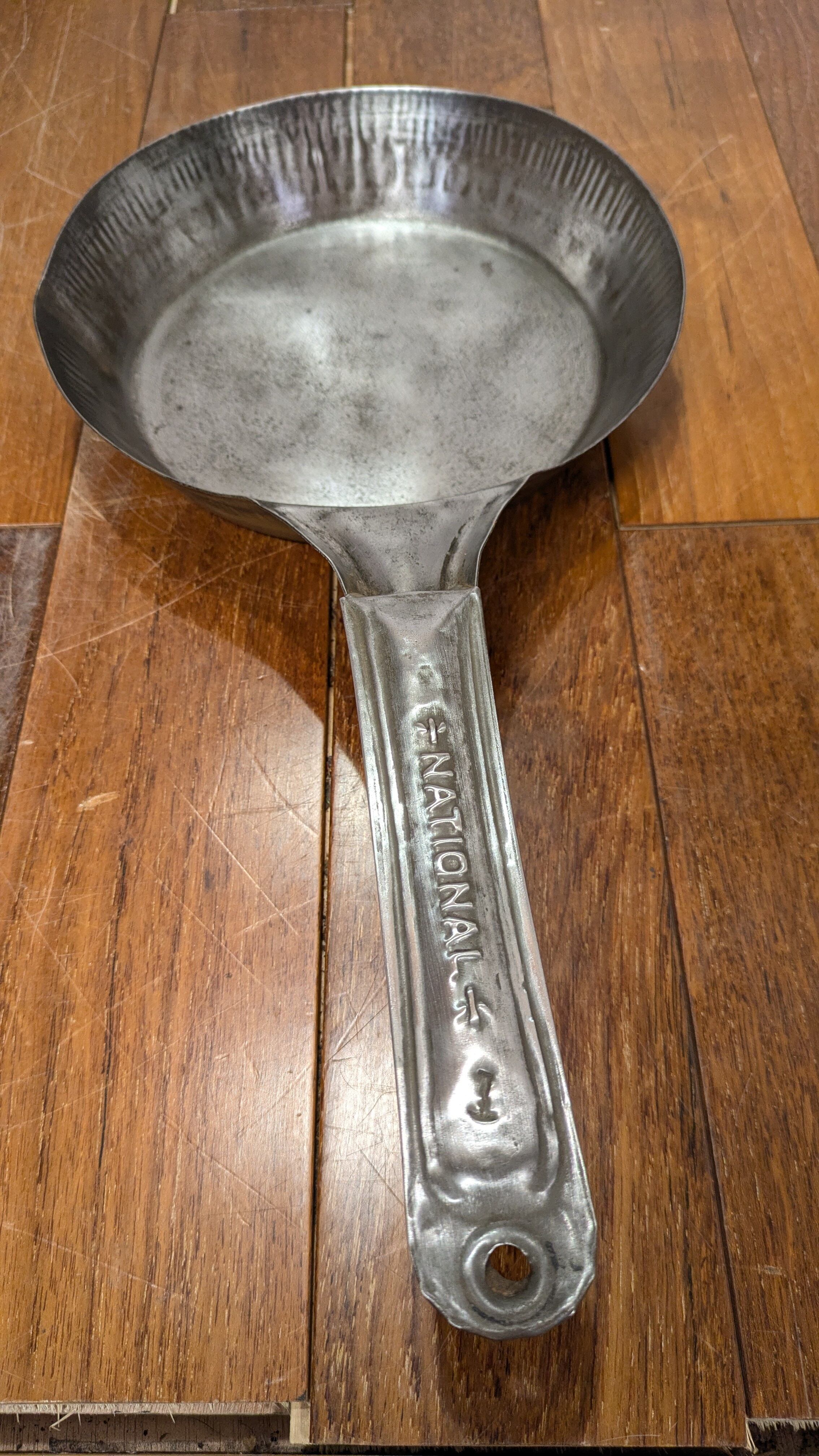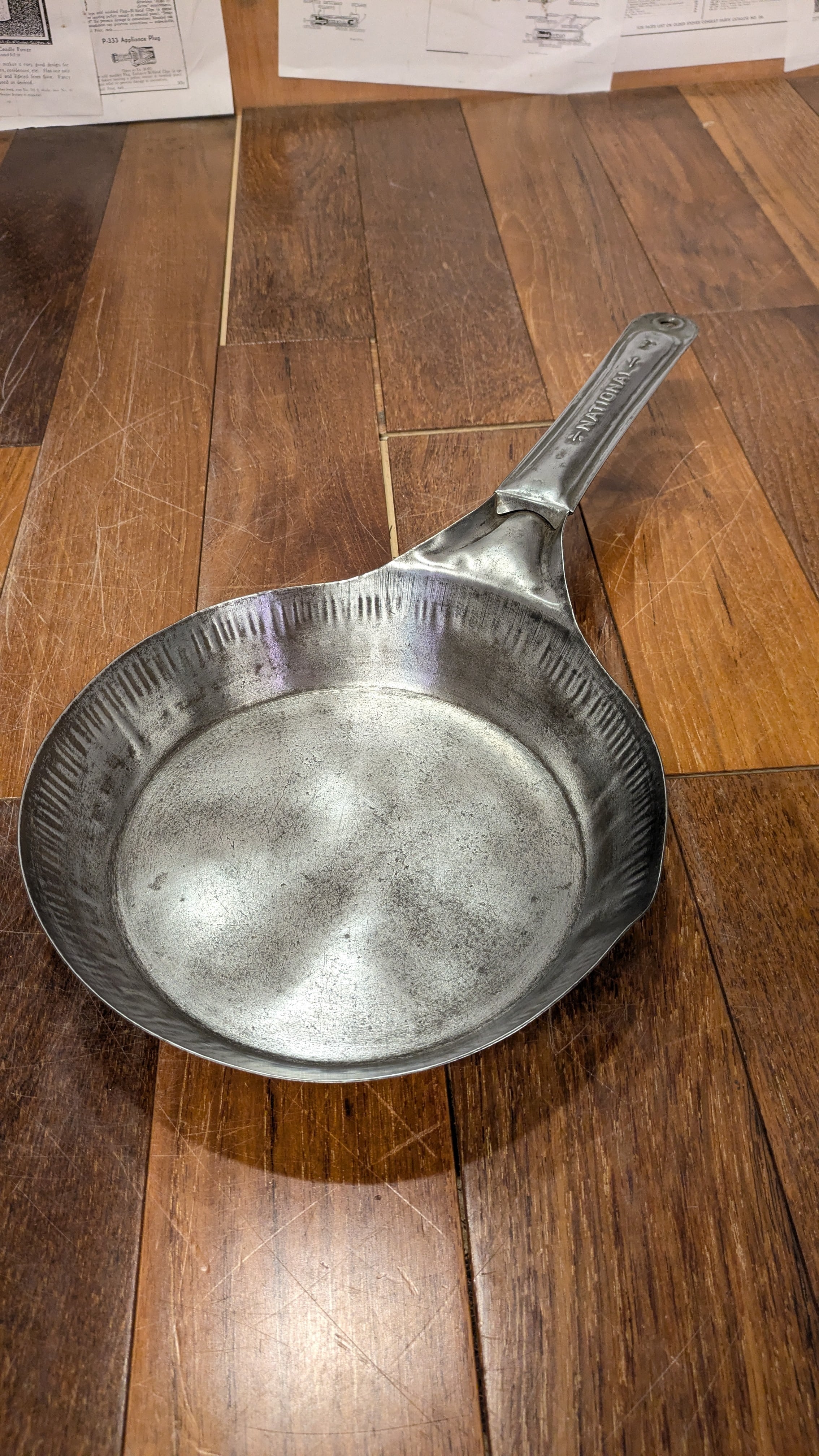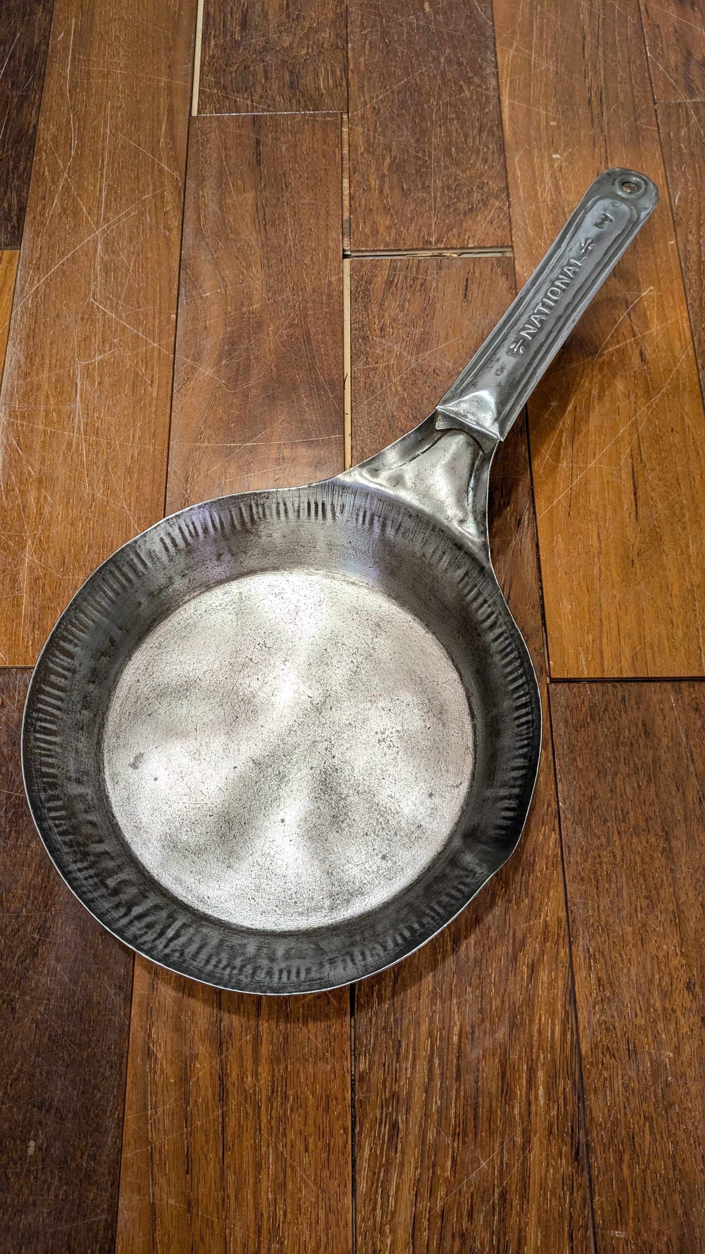 ハンドルに入るNationalのネームの渋いエンボスが入ったスチールフライパンです。