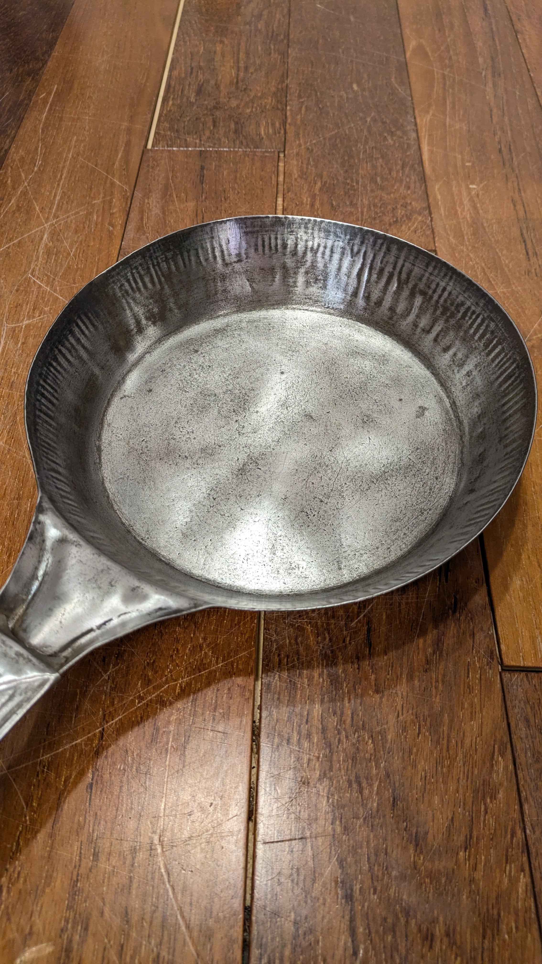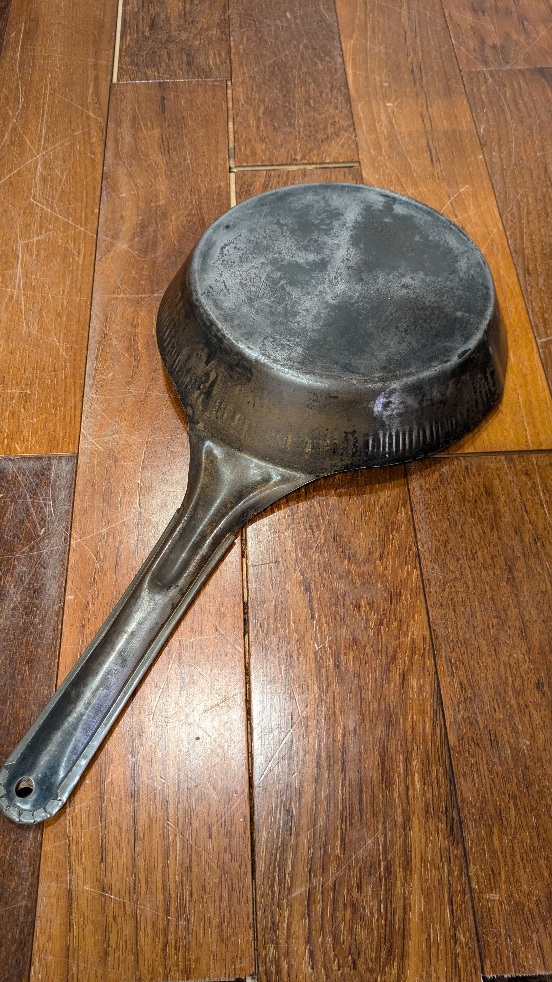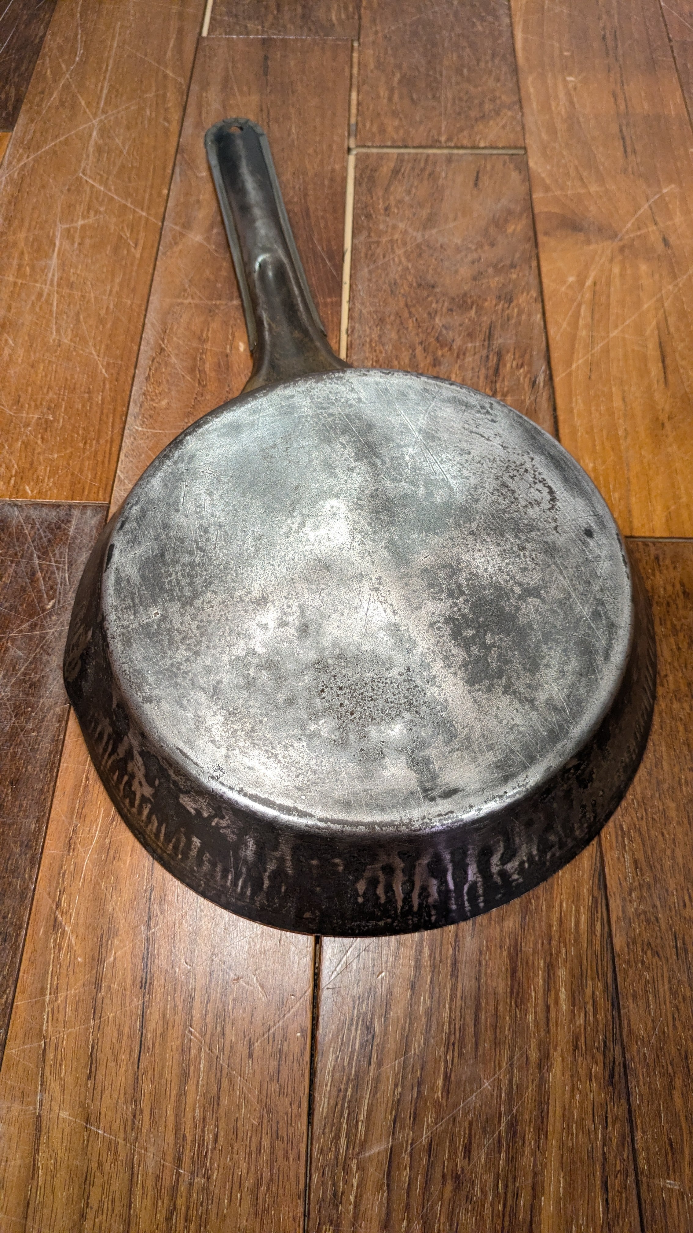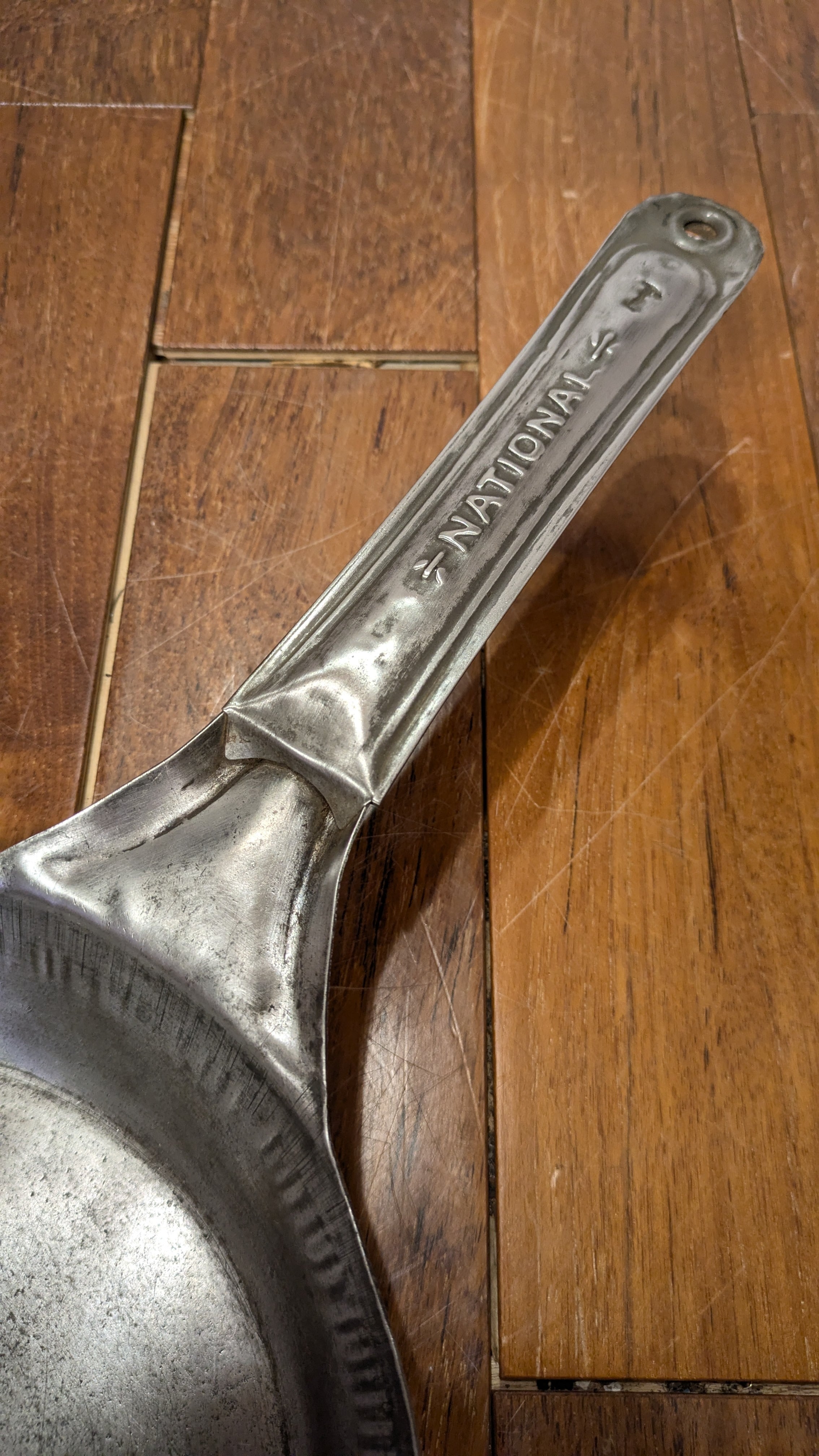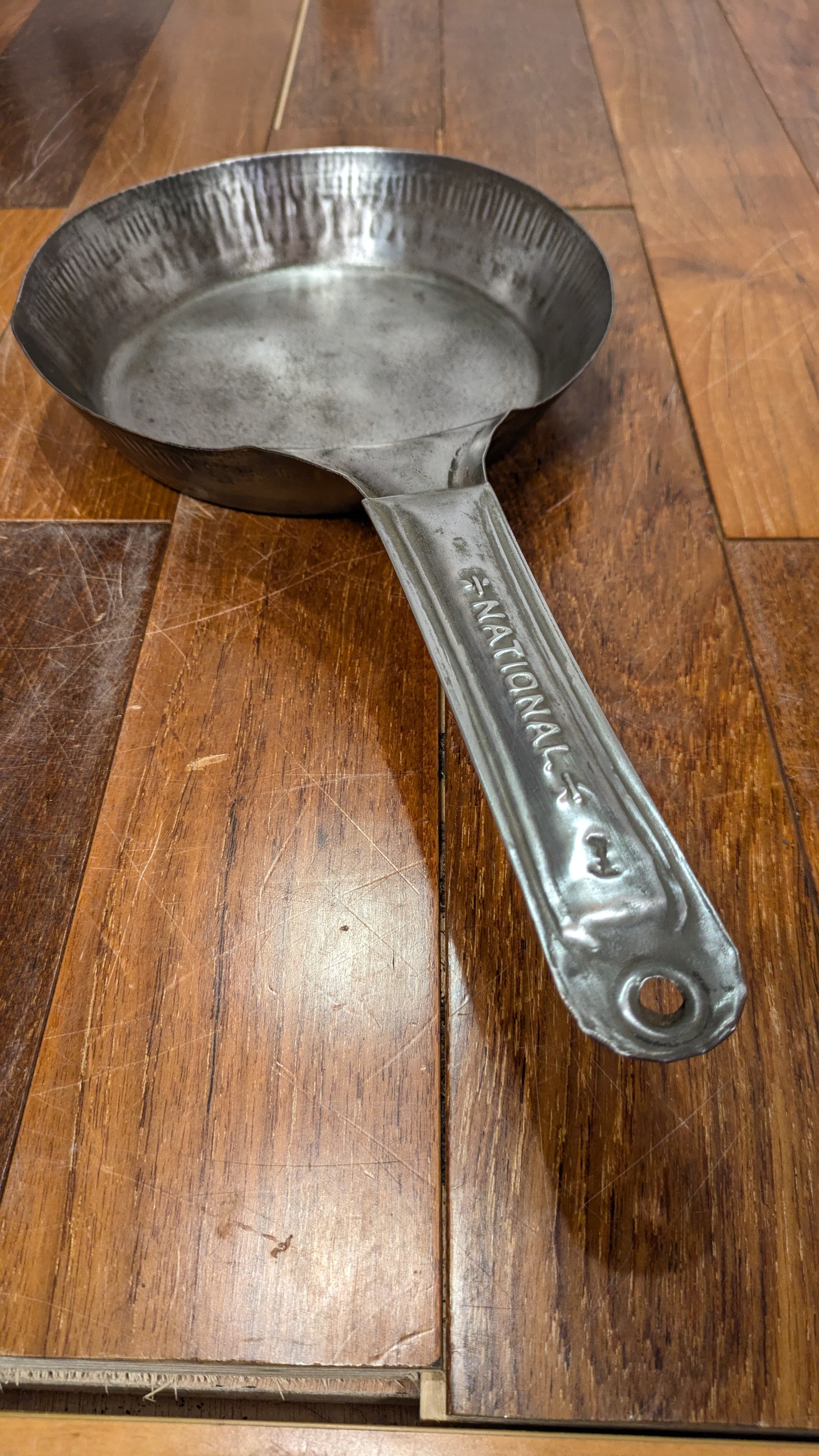 ハンドルに入るNationalのネームの渋いエンボスが入ったスチールフライパンです。